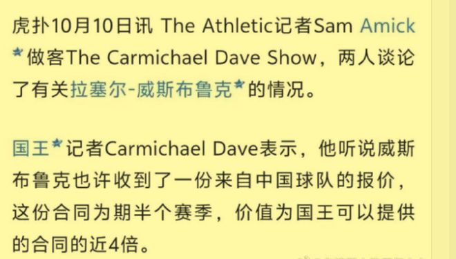 而根据NBA国王队随队体育记者卡迈克尔-戴夫的最新爆料,他说威斯布鲁克确定会来CBA联赛效力,而且那支对威斯布鲁克感兴趣的CBA球队的报价合同,竟然是国王队能给他的年薪的4倍,这也太夸张了吧?